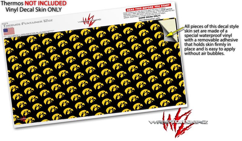 Skin Decal Wrap for Thermos Funtainer 12oz Bottle Iowa Hawkeyes Tigerhawk Tiled 06 Gold on Black (BOTTLE NOT INCLUDED)