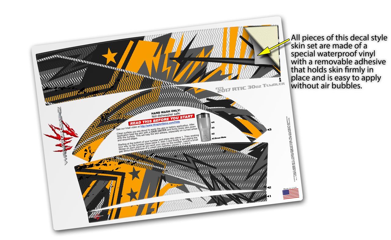 WraptorSkinz® skin wraps for 2017 RTIC Tumblers are printed using superb photo quality designs and vibrant colors printed with special fade resistant inks that last even in direct sun for years. WraptorSkinz® are a composite of two layers of commercial grade materials. The bottom layer is a soft, flexible vinyl with a special removable adhesive that is easily positioned, applied without air bubbles. Next we print the bottom layer with UV protected, fade resistant inks that deliver superb photo quality designs in vibrant colors. Finally we bond a professional grade laminate over the entire skin adding a glossy protective finish.