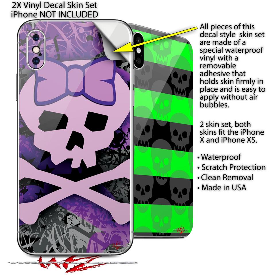 2 Decal style Skin Wraps set for Apple iPhone X and XS Purple Girly Skull