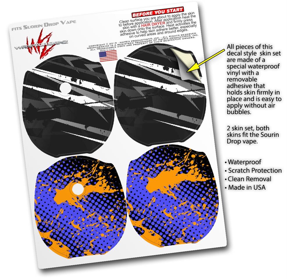 WraptorSkinz® skin wraps compatible with Suorin Drop Vape are printed using superb photo quality designs and vibrant colors printed with special fade resistant inks that last even in direct sun for years. WraptorSkinz are a composite of two layers of commercial grade materials. The bottom layer is a soft, flexible vinyl with a special removable adhesive that is easily positioned, applied without air bubbles. Next, we print the bottom layer with UV protected, fade resistant inks that deliver superb photo quality designs in vibrant colors. Finally, we bond a professional grade laminate over the entire skin adding a glossy protective finish. This product is not affiliated with or endorsed by Suorin.