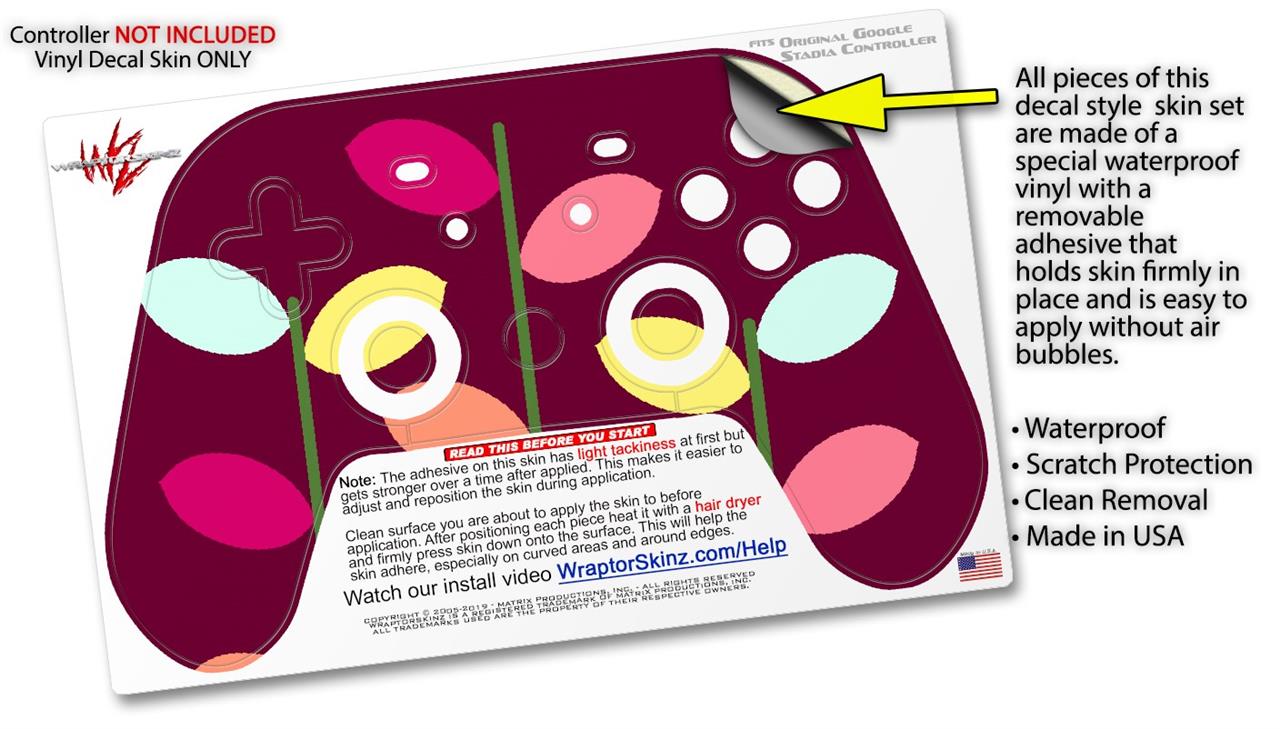 This product is in no way affiliated with or endorsed by Google. WraptorSkinz® skin wraps work with the Original Google Stadia version 1 Controller. Printed using superb photo quality designs and vibrant colors printed with special fade resistant inks that last even in direct sun for years. WraptorSkinz are a composite of two layers of commercial grade materials. The bottom layer is a soft, flexible vinyl with a special removable adhesive that is easily positioned, applied without air bubbles. Next, we print the bottom layer with UV protected, fade resistant inks that deliver superb photo quality designs in vibrant colors. Finally, we bond a professional grade laminate over the entire skin adding a glossy protective finish.