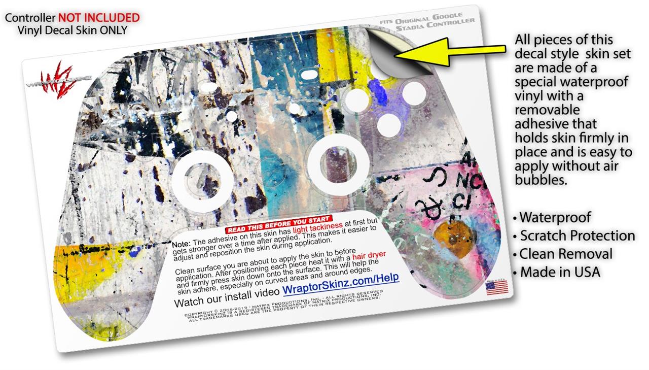 This product is in no way affiliated with or endorsed by Google. WraptorSkinz® skin wraps work with the Original Google Stadia version 1 Controller. Printed using superb photo quality designs and vibrant colors printed with special fade resistant inks that last even in direct sun for years. WraptorSkinz are a composite of two layers of commercial grade materials. The bottom layer is a soft, flexible vinyl with a special removable adhesive that is easily positioned, applied without air bubbles. Next, we print the bottom layer with UV protected, fade resistant inks that deliver superb photo quality designs in vibrant colors. Finally, we bond a professional grade laminate over the entire skin adding a glossy protective finish.