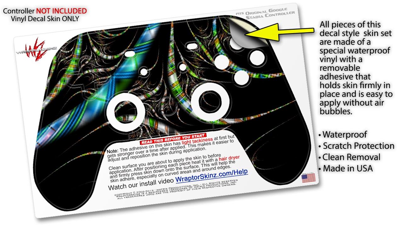 This product is in no way affiliated with or endorsed by Google. WraptorSkinz® skin wraps work with the Original Google Stadia version 1 Controller. Printed using superb photo quality designs and vibrant colors printed with special fade resistant inks that last even in direct sun for years. WraptorSkinz are a composite of two layers of commercial grade materials. The bottom layer is a soft, flexible vinyl with a special removable adhesive that is easily positioned, applied without air bubbles. Next, we print the bottom layer with UV protected, fade resistant inks that deliver superb photo quality designs in vibrant colors. Finally, we bond a professional grade laminate over the entire skin adding a glossy protective finish.