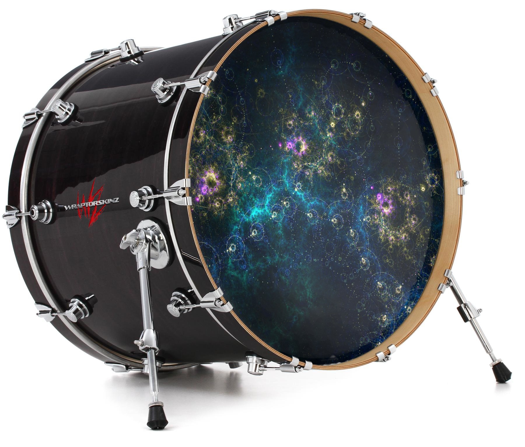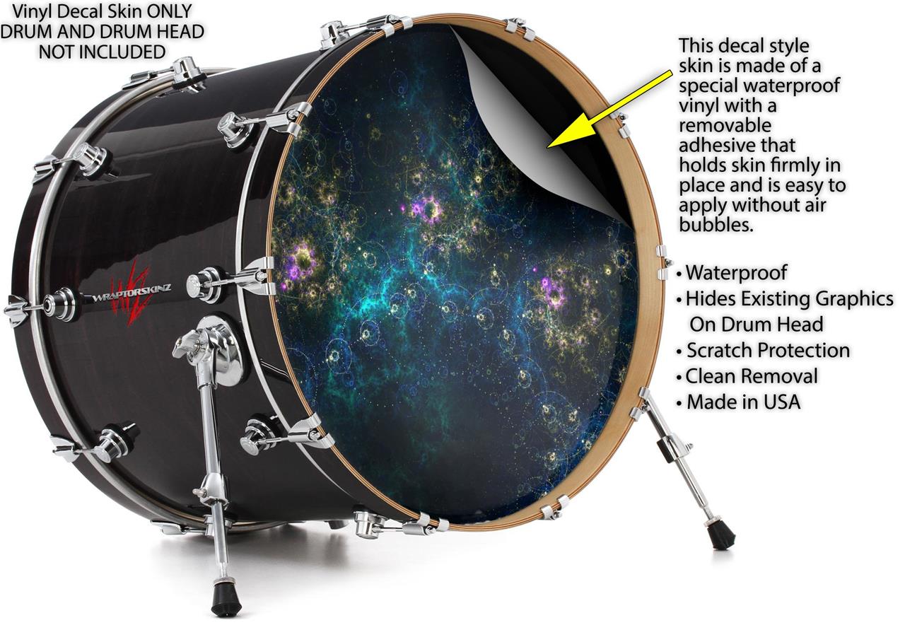This design also available in other sizes. WraptorSkinz® skin wraps compatible with most kick drum heads. Printed using superb photo quality designs and vibrant colors printed with special fade resistant inks that last even in direct sun for years. WraptorSkinz are a composite three layer commercial grade materials vinyl. The bottom layer is a air release, grey block out removable adhesive that hides existing graphics on the drum head and is easily applied without air bubbles. The middle layer is a flexible vinyl printed with UV protected, fade resistant inks that deliver superb photo quality designs in vibrant colors. Finally, we bond a professional grade laminate over the entire skin adding a glossy protective finish.