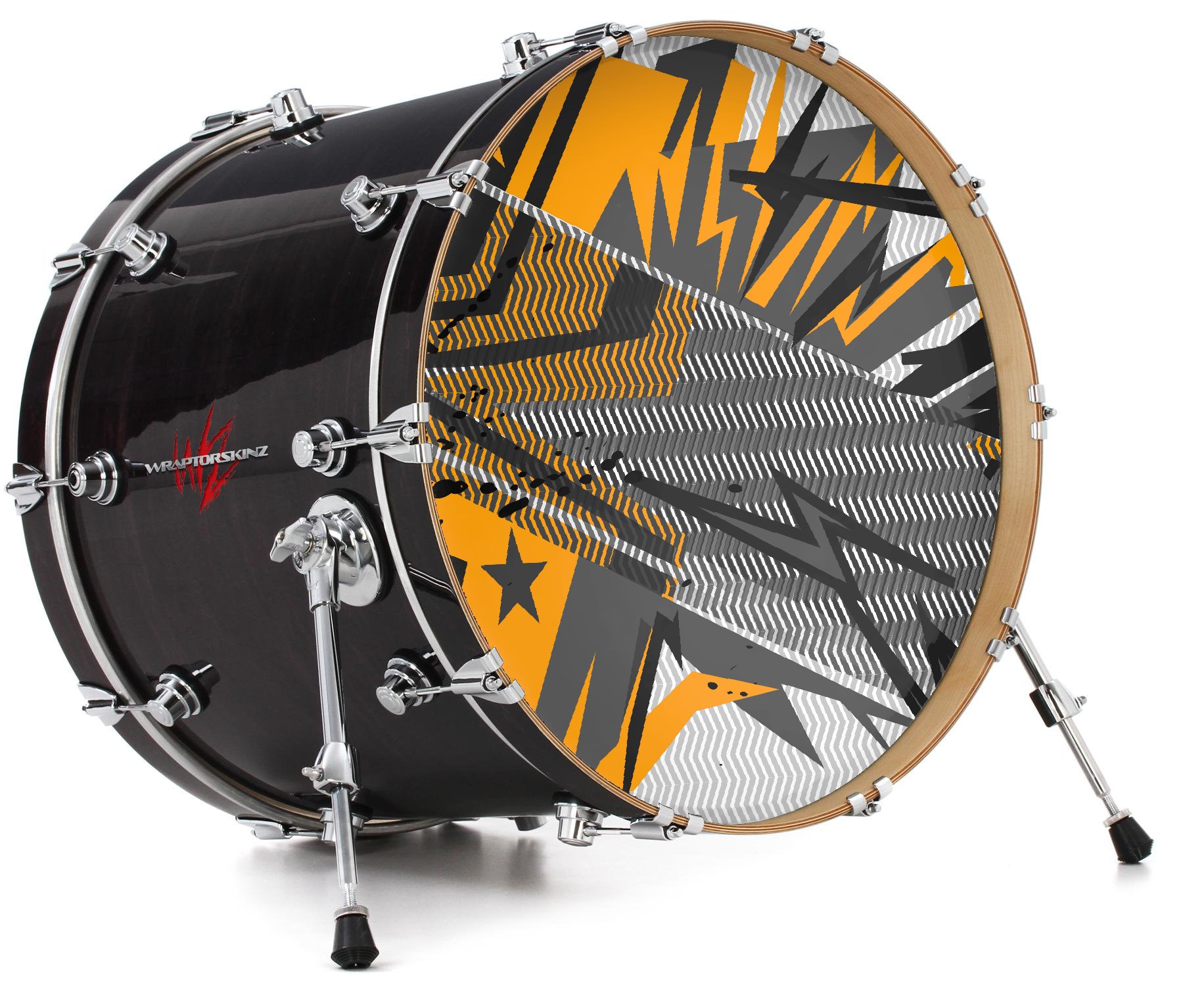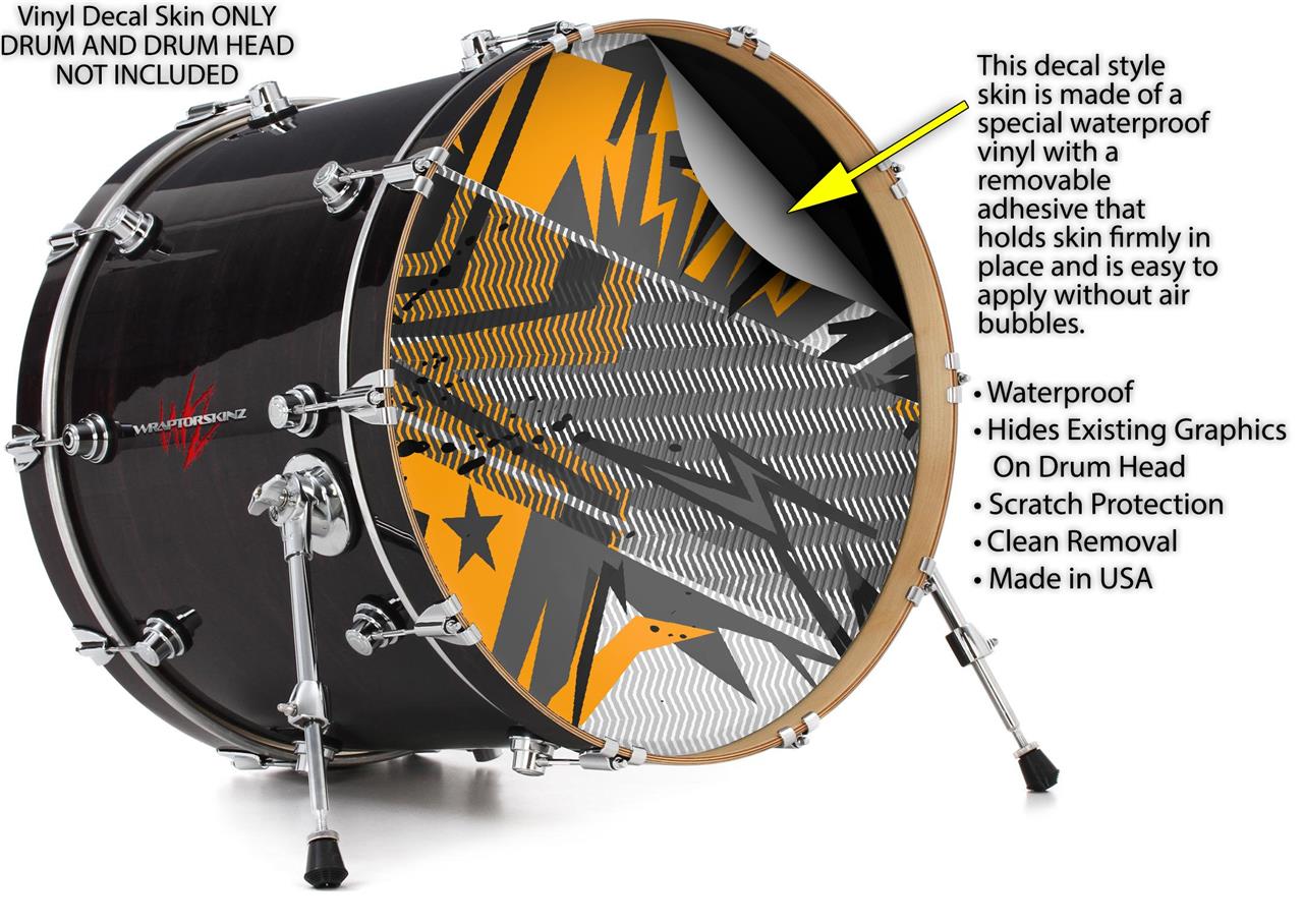 This design also available in other sizes. WraptorSkinz® skin wraps compatible with most kick drum heads. Printed using superb photo quality designs and vibrant colors printed with special fade resistant inks that last even in direct sun for years. WraptorSkinz are a composite three layer commercial grade materials vinyl. The bottom layer is a air release, grey block out removable adhesive that hides existing graphics on the drum head and is easily applied without air bubbles. The middle layer is a flexible vinyl printed with UV protected, fade resistant inks that deliver superb photo quality designs in vibrant colors. Finally, we bond a professional grade laminate over the entire skin adding a glossy protective finish.