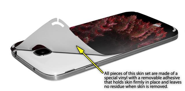 • Decal style vinyl skin covers front and back of Samsung Galaxy S4 phone.