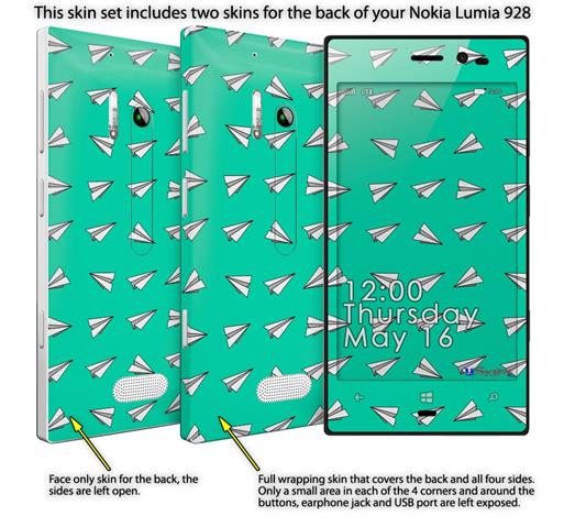 • Decal style vinyl skin covers front, back and side of Nokia Lumia 928 phone.