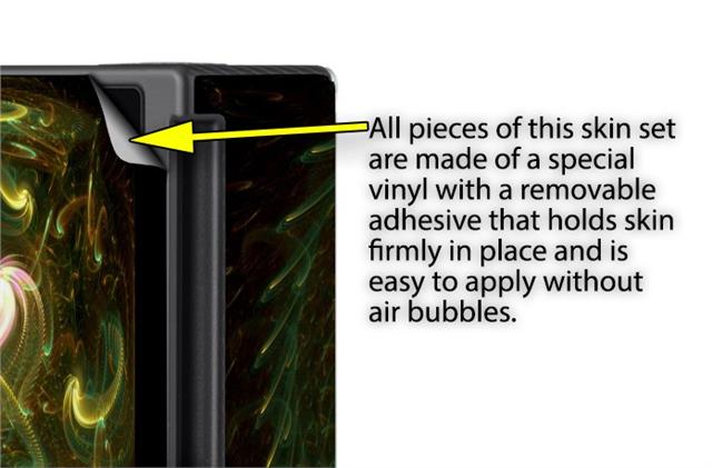 WraptoSkinz™ skins are superb photo quality designs and vibrant colors printed with special Eco-Friendly, fade resistant inks. Our skins are self-adhering flexible vinyl skins that helps prevent scratches. Made of composite, multi-layered commercial grade materials. The bottom layer is made with a special removable adhesive that is easily positioned and applied without air bubbles. We print your design on the bottom layer then bond a professional grade laminate over the entire skin adding a glossy protective finish.