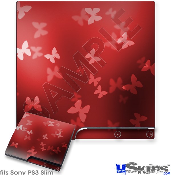 Decal Skin compatible with Sony PS3 Slim Bokeh Butterflies Red